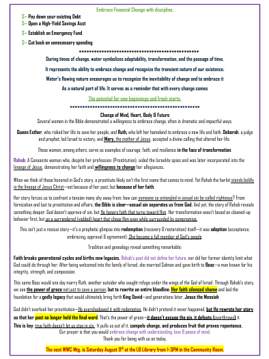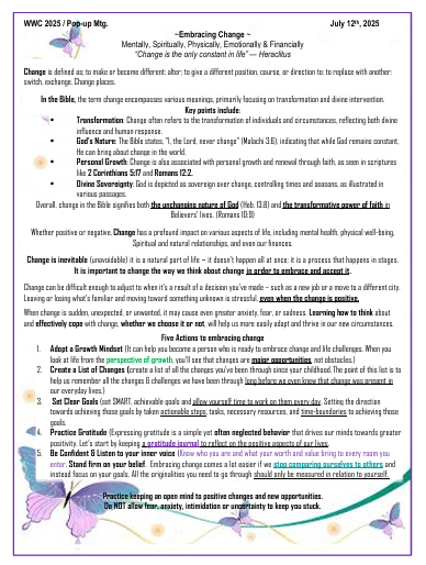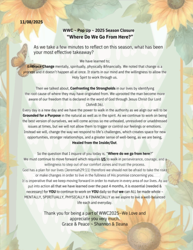 Topics of discussion Click Here: Confronting Strongholds by Shannon Turner 8/9/2025 – Confronting StrongholdsWelcome Definition 1:20Types of Strongholds 3:14Types of Strongholds Continuation 6:39Other Strongholds 9:38Breaking Free starts with Awareness 12:58Breaking Free is Seeking Truth 14:49Breaking Free is Taking Action 16:26Breaking Free is protecting yourself 17:59Summary 22:26Closing 23:16Thank you 25:15 Click here - Embracing Change by Shannon Turner 2025 – Embracing Change07/12/2025 – Embracing Change by Ileana CampbellWelcome 1:11Change Is Not The Enemy 1:40The Feminine Principle 2:48For The Women In Struggle 4:15For The Women Who Is Thriving 5:23The 12 Universal Laws 6:43Vibration, Frequency And The Reality We Create (The Law of Vibration) 7:49Change as Spiritual Rebirth (The Law of Correspondence)10:35Change as Spiritual Rebirth Cont. (The Law of Cause and Effect) 12:53Practices To Embrace Change 15:03Self Care 16:46 2024 – TRUST 06/29/2024 – Meet and Greet Presentation07/13/2024 – What is Truth?07/13/2024 – How to connect with your True Self?07/27/2024 – Relationship – Speaker Jenna Lee08/31/2024 – Understanding 08/31/2024 – Surrender – “Learning how to let go”09/14/2024 – Trust2023 – Matters of the Heart – Part twoIdentify the IssueExamine OurselvesForgiveBe Healed2022 – Matters of the HeartAdmittanceAssessmentCare InstructionsAllow yourself time to heal2020 – Conquering Spiritual GiantsPride vs. HumilityAnger vs. PeaceEnvy vs. ConfidenceFear vs. TrustGuilt vs. Forgiveness2019 – Metamorphosis, Transformation & RebirthEndurance – EmotionsChange – PhysicalHope – Mental (Retraining the Mind)Life – Spirit